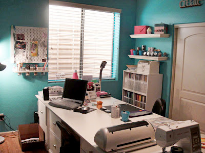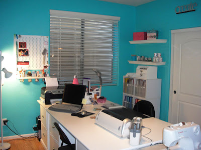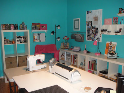 In 2008 I decided I wanted my workspace in the middle of the room. This made wall space available and I added the 3 IKEA Expedit shelves along the side wall and the Lisa and Becky wall system (that is no longer available). This give me some counter space to work with for tools and machines. The little bookshelf that was in the corner was replaced in this update. I also got rid of the white chairs, they were cute but not functional or comfortable and they didn't roll on the floor well.