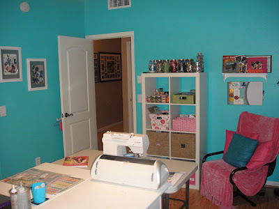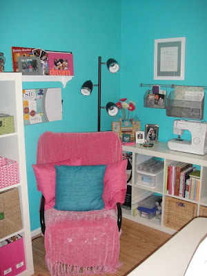 I didn't like having carpet in the room, it made me afraid to get messy. So we ripped it out and put in laminate wood flooring. I wanted happy bright colors and settled on this teal blue and accented the room with hot pink.