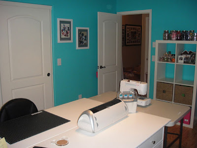I had my "thinking" chair and lots of room. I was very excited with the space...but the colors were uninspiring. We also had just got puppies and I didn't trust them on the carpet at the time, but I wanted them down in the room with me while I was scrapping.