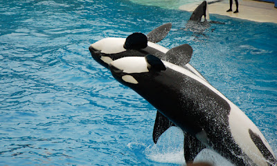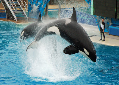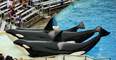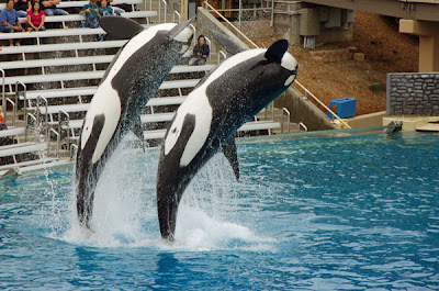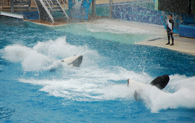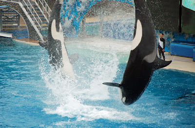 We took a popcorn and pretzel break after the show and then it was time for Shamu. This show was a bit more crowded. The boys did fine; Nicholas needed to sit on my lap to see. He seemed to enjoy the show. We all really enjoyed the Shamu show. It is just incredible what these whales are trained to do. And I was so happy I had bought my zoom lens before this trip, or I would never have gotten shots like this from as far away as we were.