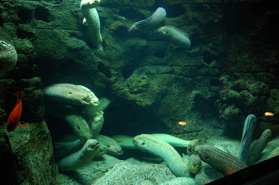 We visited the batrays/stingrays and Morrey Eels. Mike pet a batray. Nicholas remembered getting splashed by one at the Phoenix Zoo and wanted nothing to do with them. There was a cave to walk through with the eels and they were quite strange looking. Fascinating and creepy at the same time.